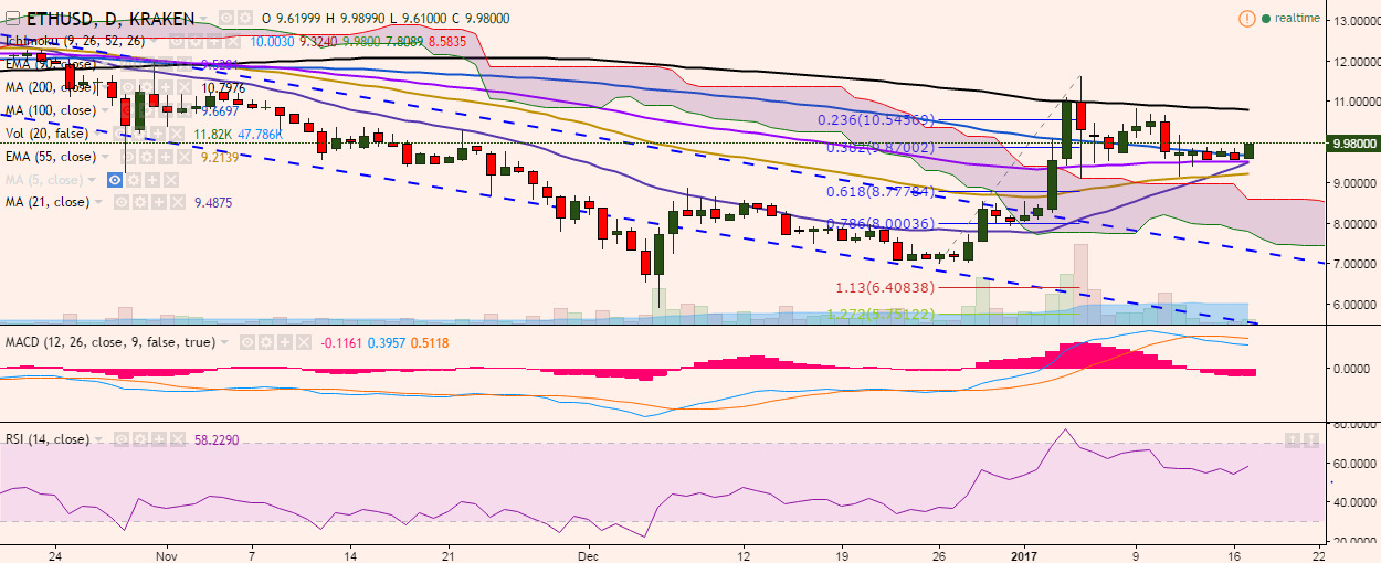 ETH/USD has broken 38.2% fib and is trading just shy of 10.00 levels at press time (Kraken).