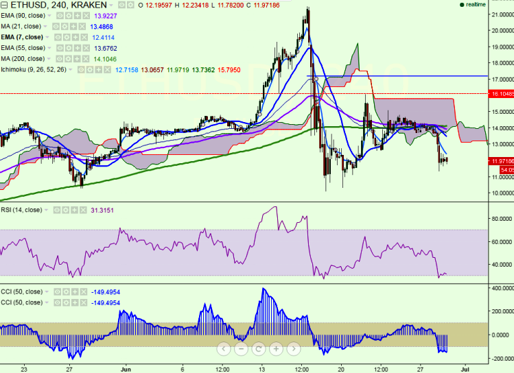 ETH/USD traded in the red on Wednesday and has broken a major support at $12.60 (Jun 23 low). It is currently trading at $11.91 levels (Kraken).