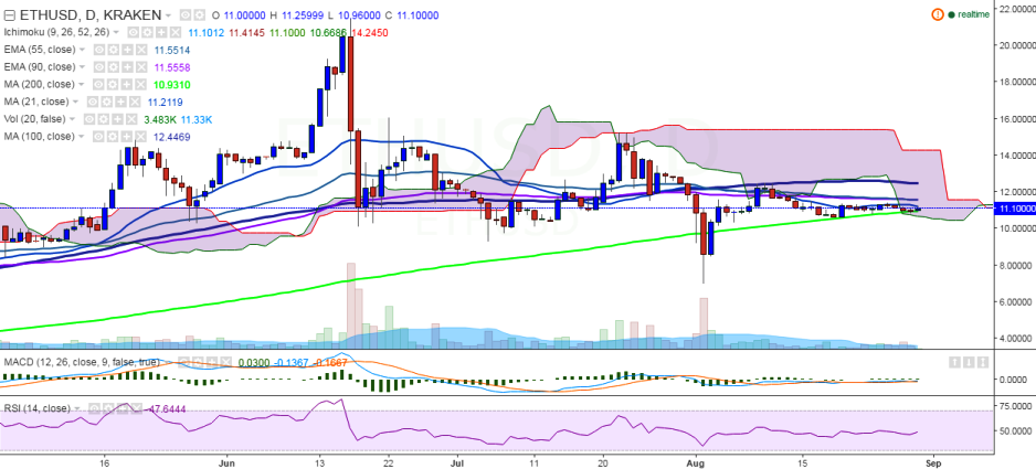 ETH/USD continues to trade in a narrow range on Tuesday and is trying to sustain above 200-day MA. It is currently trading at 11.02 levels, at the time of writing (Kraken).
