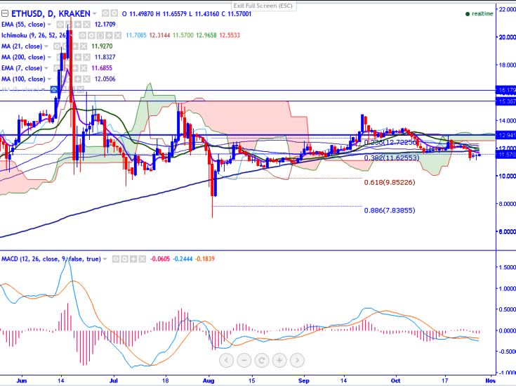 ETH/USD has slightly recovered after declining till $11.16 (KRAKEN). It is currently trading around $11.57 at the time of writing.