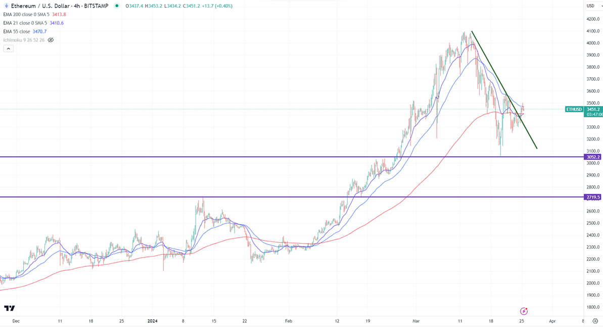 ETHUSD showed a minor pullback on upbeat market sentiment. It hit a high of $3502 and is currently trading around $3452.