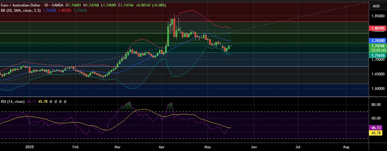 • Immediate support is seen at 1.7244 (61.8% fib) and break below could take the pair towards 1.7172(Lower BB).