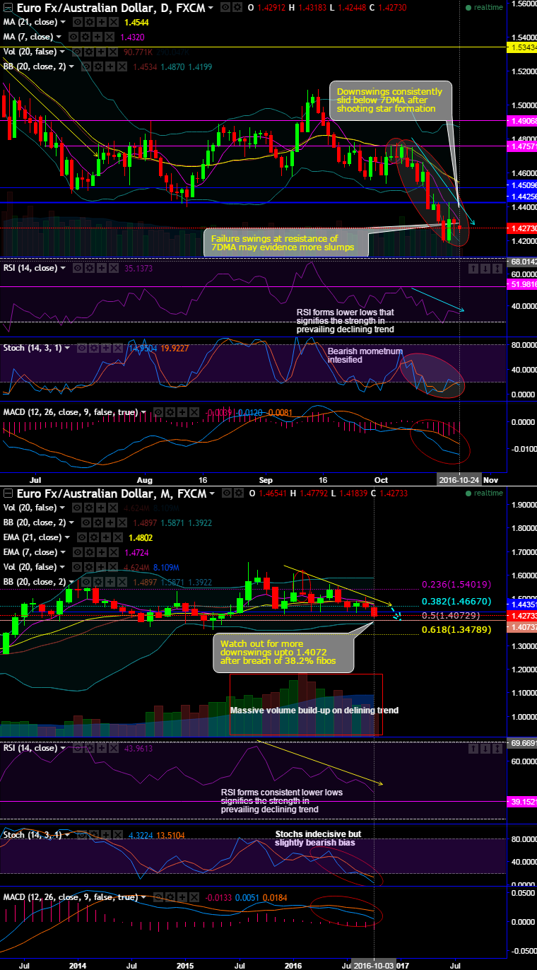 On daily charts, the failure swings are now going in sideways but bearish bias, bounce above 7DMA may resume rallies max. up to 1.4425 or 1.4544 levels, and sustenance below can pull back slumps up to 1.4180 levels.
