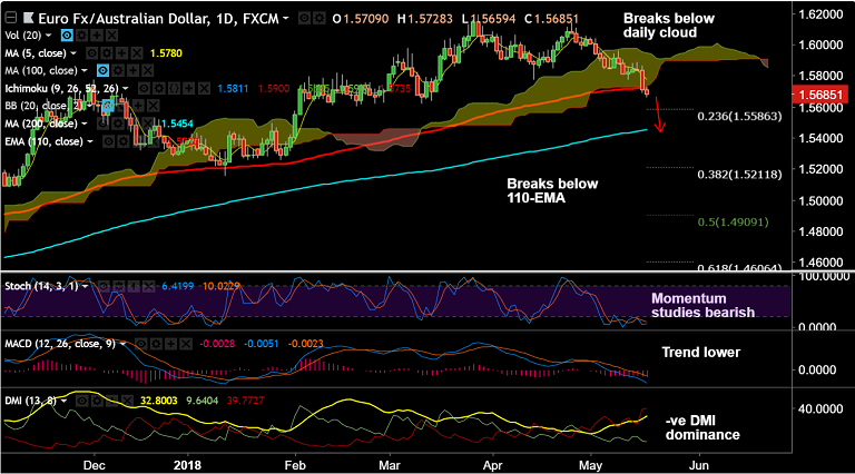 - EUR/AUD is extending weakness after break below 110-EMA at 1.5720, bias lower.