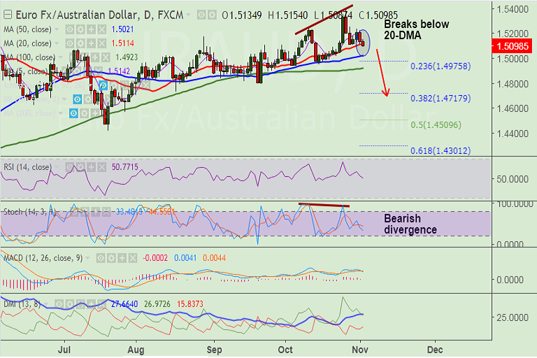 - EUR/AUD has slipped below 20-DMA at 1.5114, bias lower. We see scope for test of 50-DMA at 1.5021.