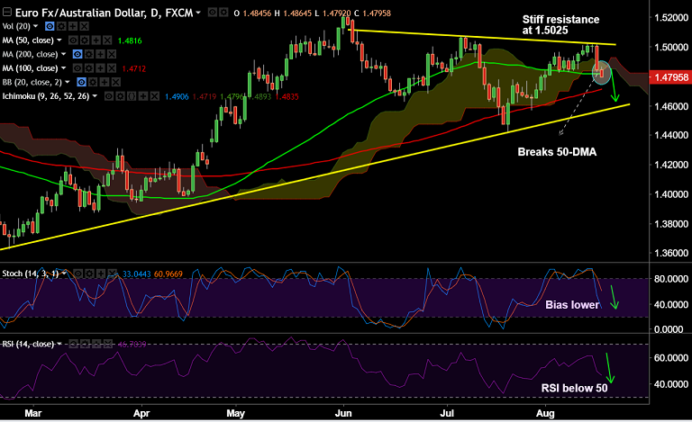 - EUR/AUD was rejected at major trendline resistance at 1.5025, is extending downside for 2nd successive session.