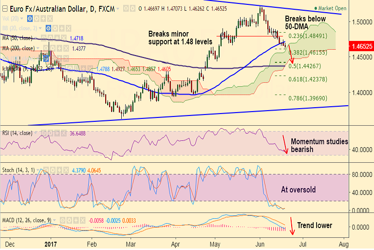 - EUR/AUD has shown a break below 50-DMA at 1.4718, we see scope for further downside.