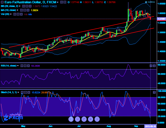 EURAUD looks like breaking channel line support back again to move towards south around 1.5315 levels, while leading oscillators also signal bearish calls as they are converging downwards to the dropping prices. RSI curve is currently trending at 50.8106 and %D line cross at 46 region (%D is around 29.7818 and %K is at 18.9664). Prices are falling well below moving average curve as well, so believe with all these bearish indications to drag this pair towards 1.5315 levels.