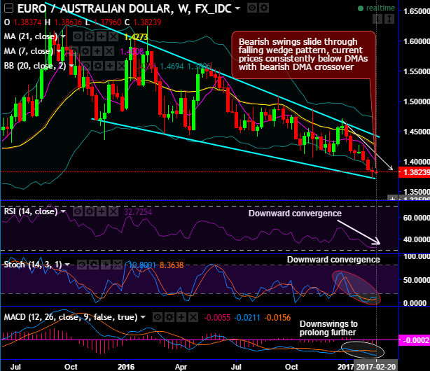Please note that the price behavior has been sliding through falling wedge formation which is bearish in nature on both weekly and monthly charts, after breaking major supports at 1.4075 levels, bear streaks have been intensified. We could foresee more downswings especially after bearish EMA crossover with bearish convergence in leading oscillators.