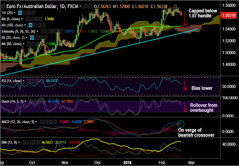 - EUR/AUD has been capped below 1.57 handle, trades 0.27% lower on the day.