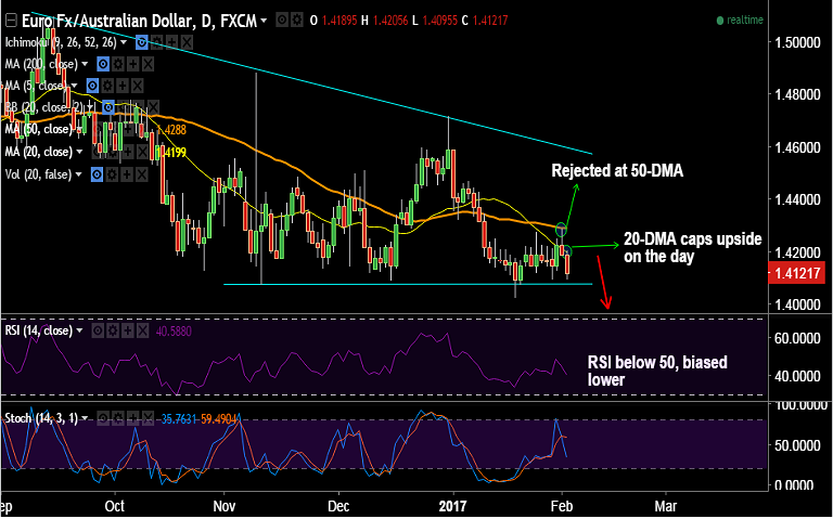 - EUR/AUD was rejected by 50-DMA at 1.42941 on Wednesday's trade.
