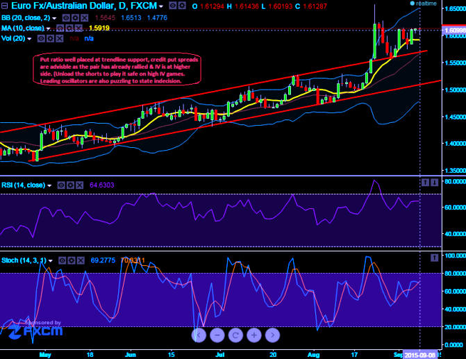 As the implied volatility of ATM options is flashing at 11.72%, it is quite riskier to build strategy with more number of shorts when IV is moderated. Moreover, the pair has already rallied onto 1.6005 levels, so it is advisable to build portfolio with credit put spread instead of put ratio spread at this point in time.