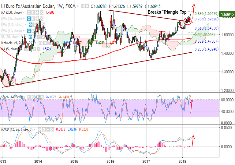 - EUR/AUD is extending breakout above 'Symmetric Triangle' pattern and we see scope for further upside.