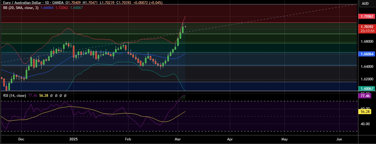 • EUR/AUD rose above 1.7000 level on Wednesday as investors flocked to the euro amid optimism over the German spending proposal.