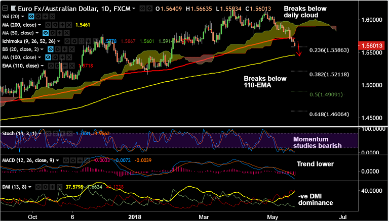 - EUR/AUD is extending weakness below daily cloud, hovers around 23.6% Fib retracement at 1.5586.