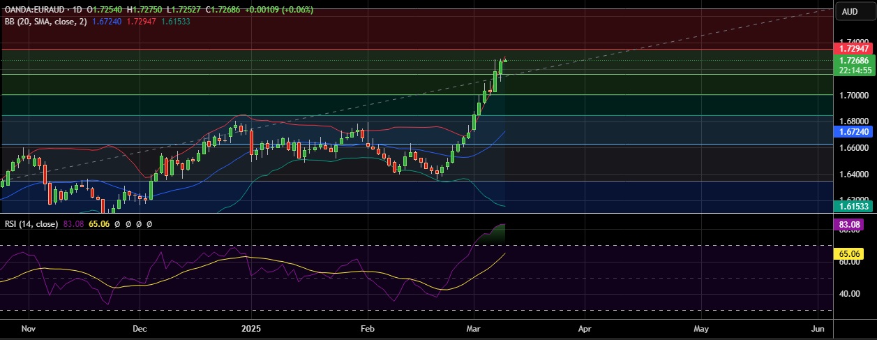 • EUR/AUD strengthened on Monday as euro continues to gain on German stimulus optimism.