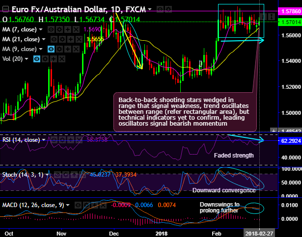 Chart and candlestick formed: EURAUD forms whipsaws pattern on both daily and 4th weekly and shooting stars, gravestone doji have occurred at 1.5676 and 1.5683 levels respectively on weekly chart to signal weakness.