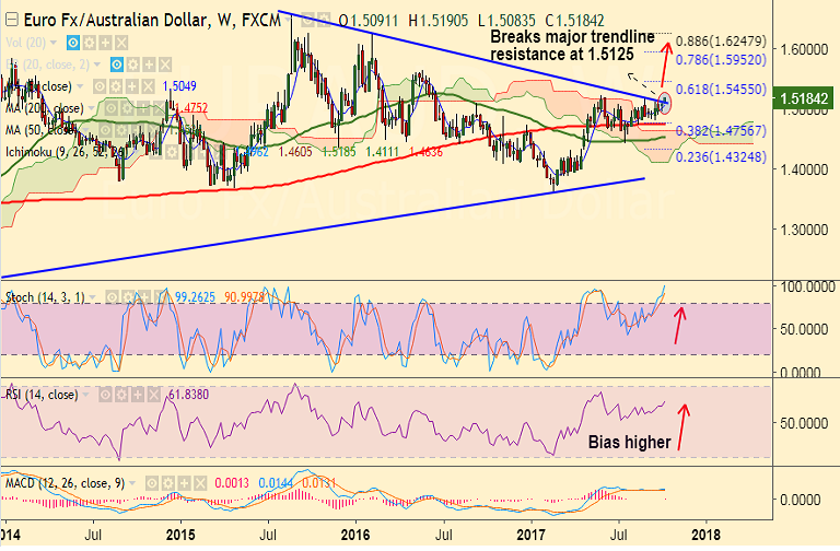 - EUR/AUD hits 4-month highs at 1.5190, intraday bias higher.