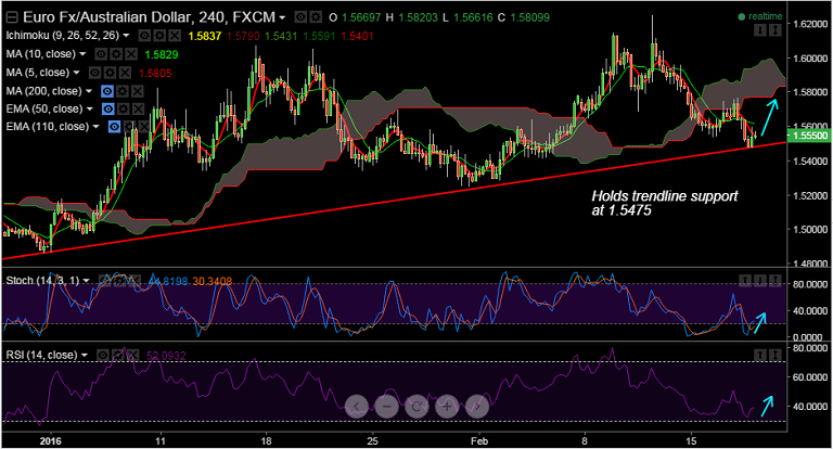 EUR/AUD has taken strong trendline support at 1.5475 and edged higher, gains upto 1.5630 likely.