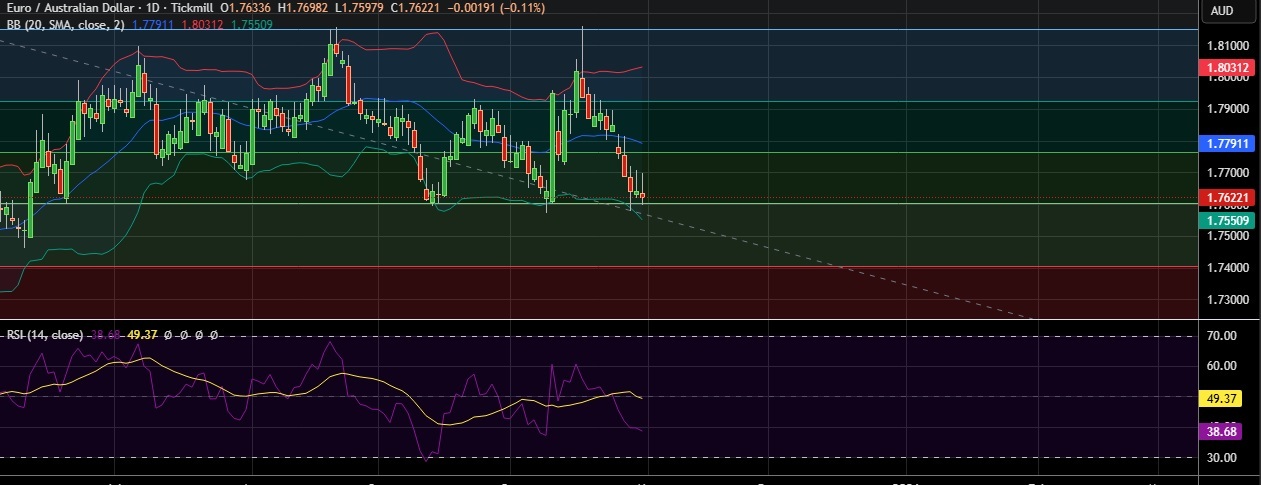 • Strong support is seen at 1.7609( 23.6%fib)and break below could take the pair towards 1.7552(Lower BB)