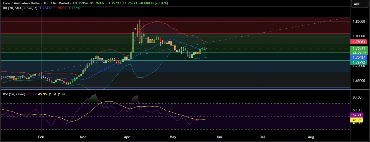 • Immediate support is seen at 1.7495 (50% fib) and break below could take the pair towards 1.72982(Lower BB).