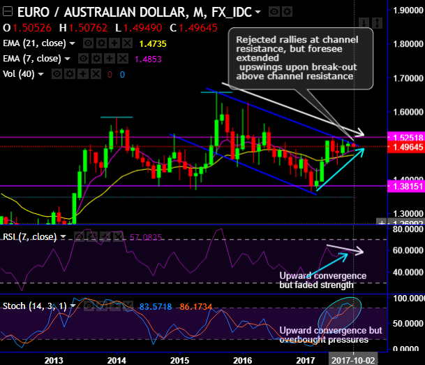On a broader perspective, the major trend has been sliding southwards in a sloping channel, the upswings have now been rejected by cautious bears at the same channel resistance, but foresee extended upswings upon break-out above channel resistance.