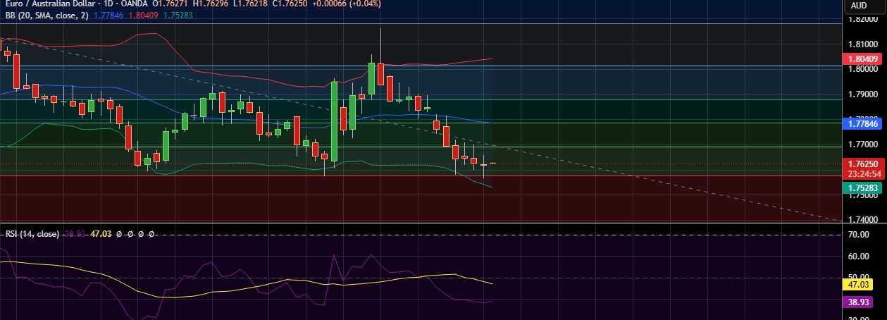 • Support is seen at 1.7579 (23.6%fib) and break below could take the pair towards 1.7531(Lower BB).