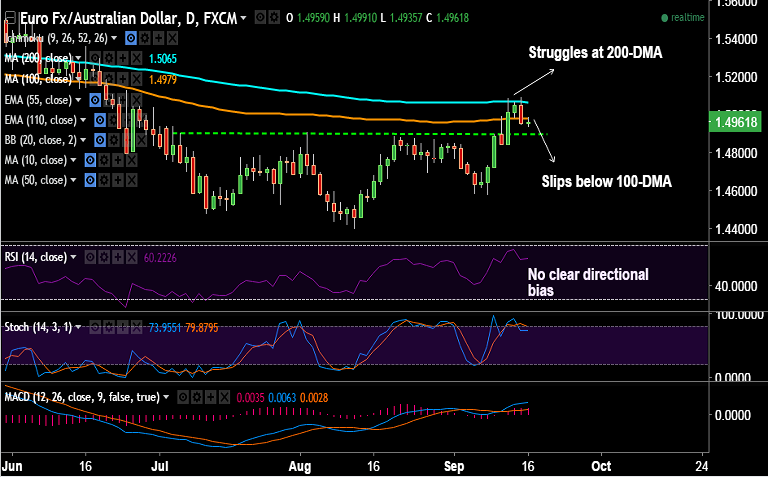 - The pair has cleared slipped below 100-DMA at 1.4979, we see no clear directional bias.