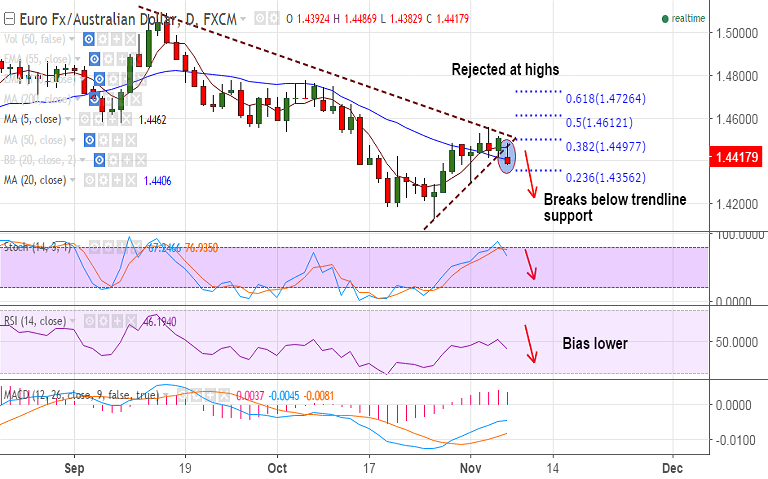 - EUR/AUD was rejected at highs around 1.4487, slips below 20-DMA at 1.4405.