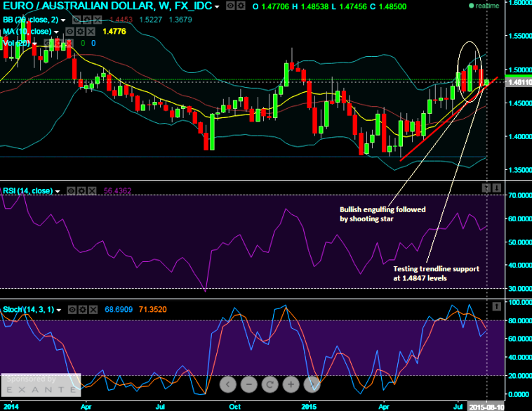 This pair has been puzzling a lot by evidencing speculative price fluctuations but ever since a bullish engulfing pattern candle occurred the leading oscillators have not been showing clear signals. The bullish engulfing pattern at 1.5064 has counter attacked by a shooting star at 1.5006 levels. Weekly RSI trending near 56.4194 converging with prices dips and spikes accordingly but there is no clarity of the direction, while %D line crossover on slow stochastic above 80 levels signifies overbought pressure. More importantly the pair is now at this juncture testing crucial trend line support at 1.4847 levels.