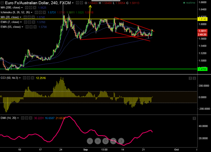 - EUR/AUD has made a low of 1.5600 yesterday and recovered from that level. It is currently trading at 1.5833. Overall trend is still weak as long as resistance 1.4950 holds