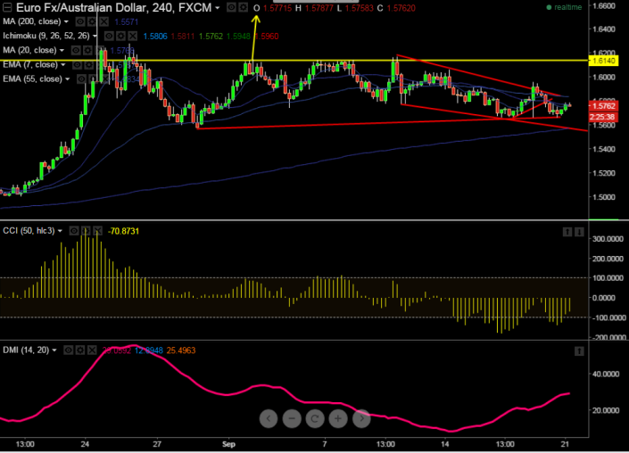 - EUR/AUD has been consolidating in narrow range between 1.6065-1.5660 for the past three trading session. The pair has made a low of 1.5660 on Friday and recovered from that level. It is currently trading at 1.5766.