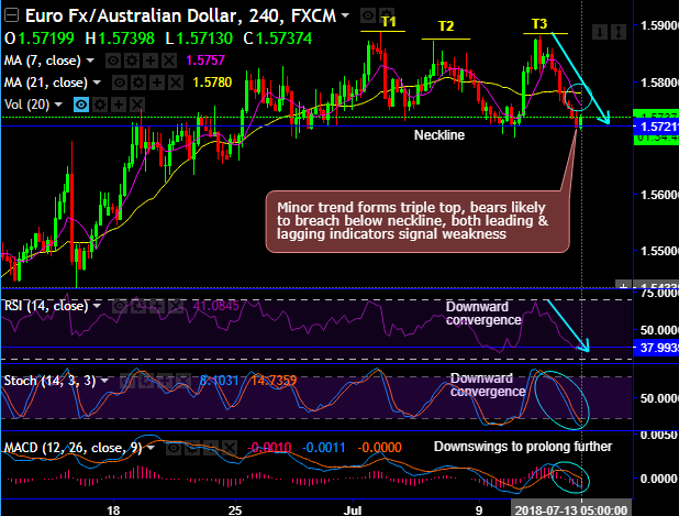 EURAUD minor trend forms the triple top pattern which is bearish in nature, top 1 at 1.5887, top 2 at 1.5870, top 3 at 1.5812 and neckline at 1.5721 levels.