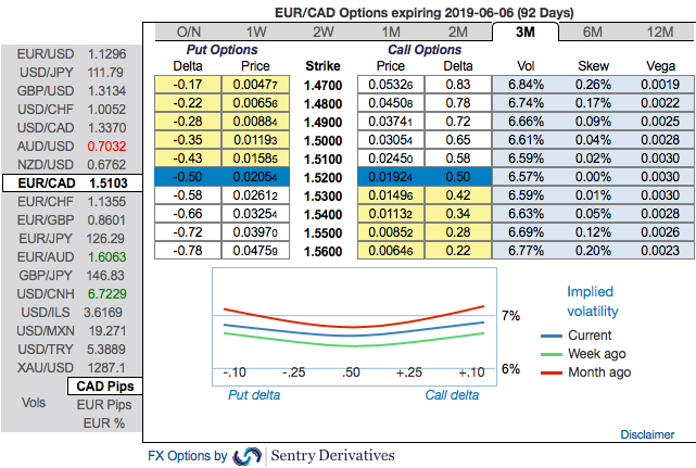The Execution of Options Strategy: At spot reference: 1.5102, contemplating all the above driving forces and OTC indications, we uphold our previous strategy by advocating initiating longs in 3M EURCAD at the money -0.49 delta put, and go long in at the money +0.51 delta call of similar expiry and simultaneously, short 2w (1%) out of the money calls. Thereby, we favor slightly on upside risks as short leg likely to reduce long legs. Courtesy: Sentrix