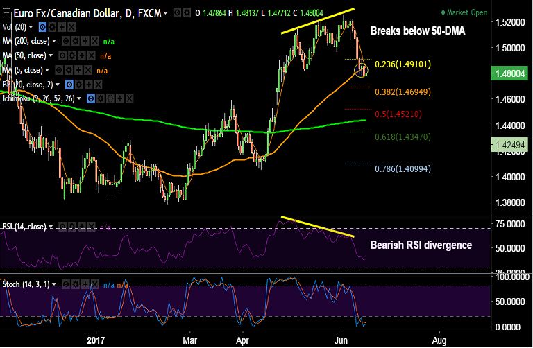 - EUR/CAD has shown break below 50-DMA on Thursday's trade, intraday bias bearish.