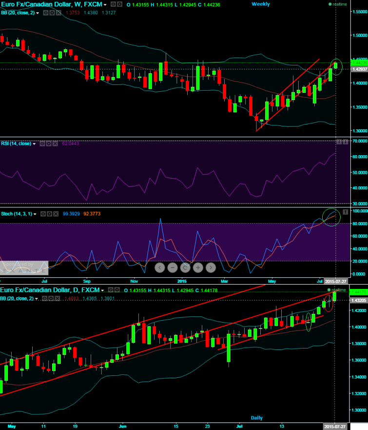 On daily charts of EURCAD a serious Doji is formed to trace out caution for bulls. As per our earlier recommendation uptrend continuation persisted as inverted hammer pattern candle occurred at 1.4058 levels which is to be considered as a caution of continuation of upswings. But for now a sharp Doji is formed at 1.4313 levels followed by a long real body candle with day's high (or week's high) testing resistance exactly at trend line at 1.4431 levels. RSI and slow stochastioc are still showing strength in convergence of rising prices.