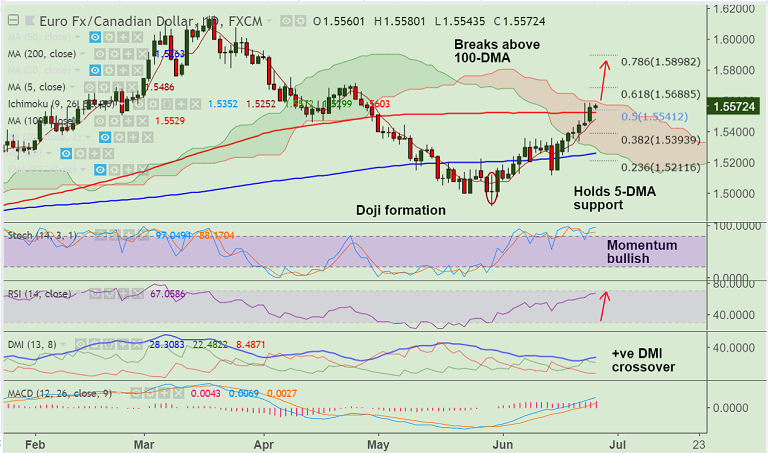 - EUR/CAD is consolidating a break above 100-DMA on Friday's trade, slips below to close at 1.5455.
