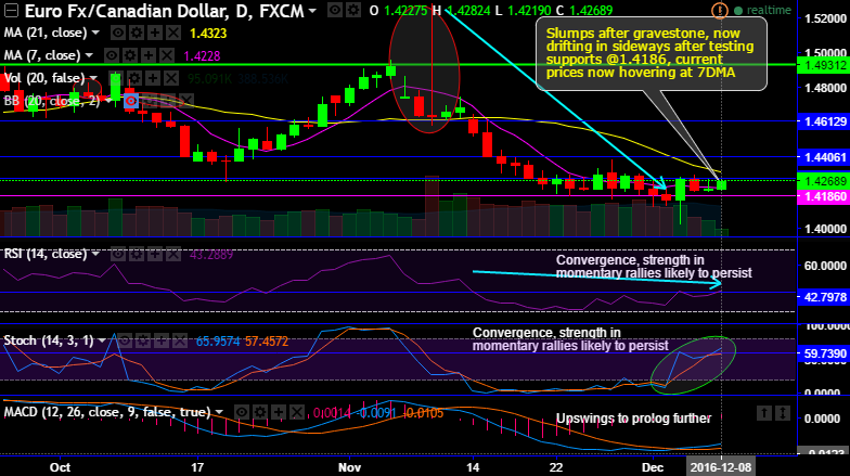 Massive slumps after gravestone, now drifting in sideways after testing supports @1.4186, current prices now hovering at 7DMA, a decisive break or failure swings at 1.43 would be cautiously watched.
