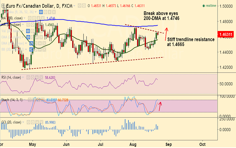 - EUR/CAD upside halts by stiff trendline resistance at 1.4665, bias higher.