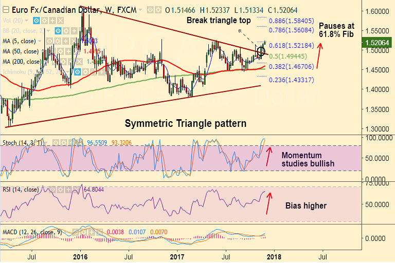 - The pair is extending gains after 'Symmetric Triangle' breakout, momentum studies bullish.
