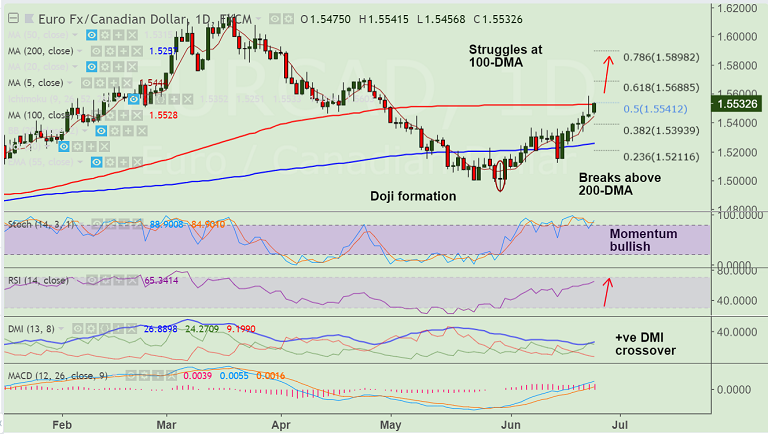 - EUR/CAD struggled to hold break above 100-DMA on Friday's trade, slips below to close at 1.5455.