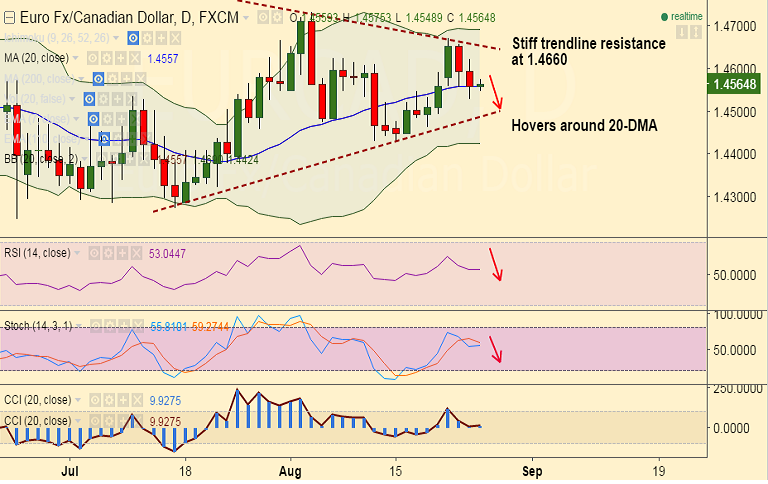 - EUR/CAD hovers around 20-day MA at 1.4557, intraday bias lower.