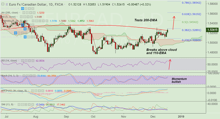 - EUR/CAD is trading 0.26% higher on the day at 1.5251 at the time of writing.