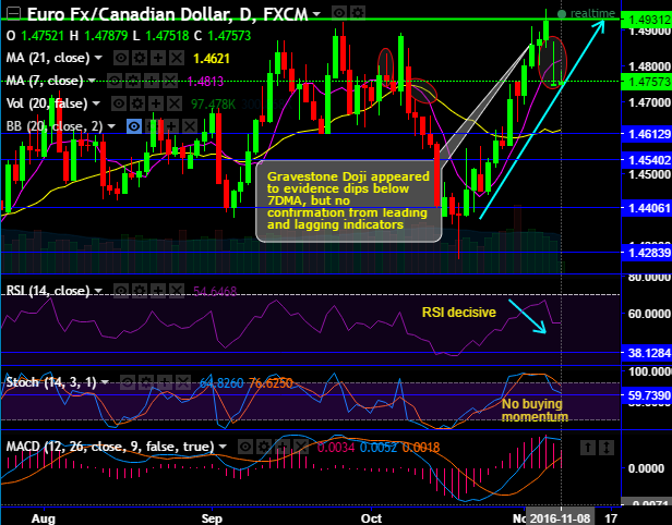 The gravestone doji appeared at 1.4752 levels to evidence dips below 7DMA, but no confirmation from leading and lagging indicators.