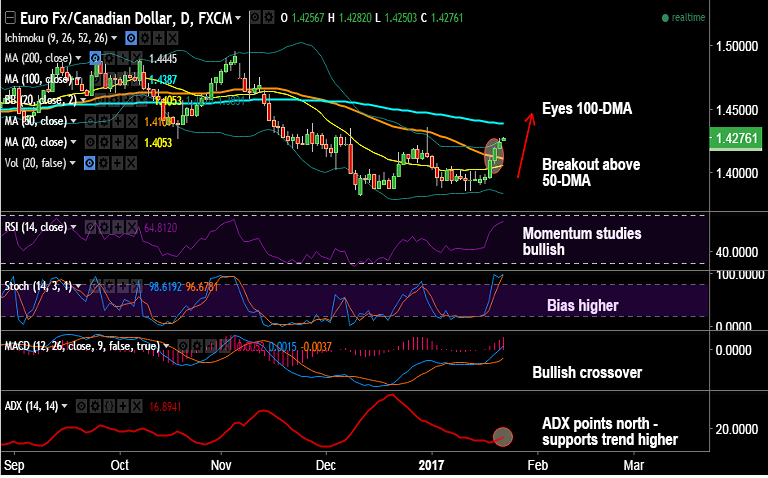 - EUR/CAD bias bullish after breakout above 50-DMA at 1.4123 on Jan 19th trade.