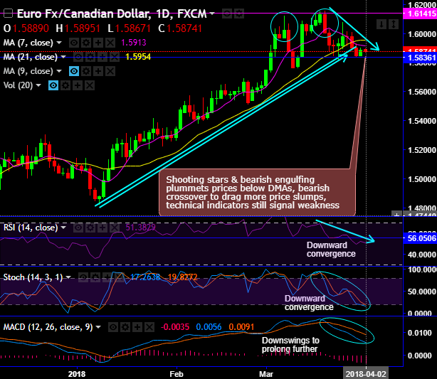 Chart and candlestick patterns formed- Shooting stars and bearish engulfing pattern candlesticks pop up at stiff resistance of 1.6141 levels. Consequently, the prices are plummeted below DMA and more price dips seem to be on cards as 7DMA crosses below 21DMA (refer daily chart). While the technical indicators still seem to be bearish bias on this timeframe.