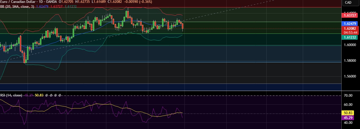 • Support is seen at 1.6142(50%fib) and break below could take the pair towards 1.6124(Lower BB).