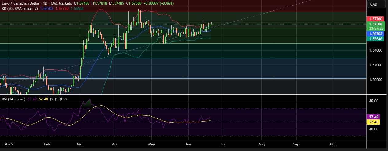 • Immediate resistance is located at 1.5782(Higher BB), any close above will push the pair towards 1.5845(June 11th high).