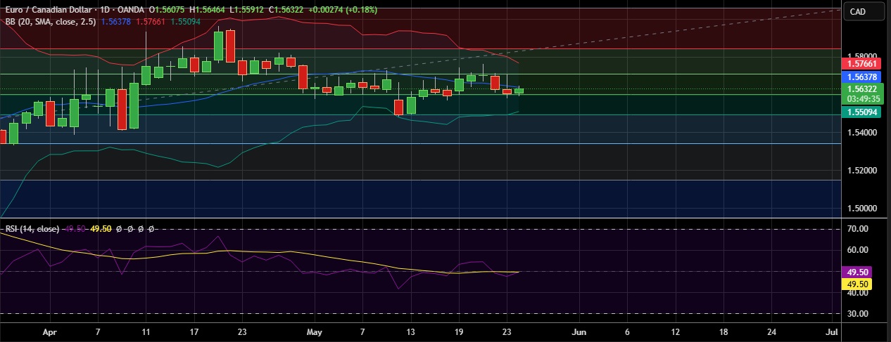 • Support is seen at 1.5601 (50%fib) and break below could take the pair towards 1.5516(Lower BB).