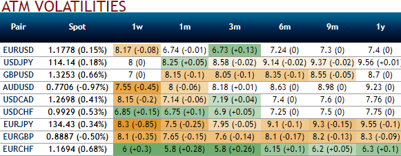 Despite uptrend that we’ve been seeing in EURCHF, positively skewed IVs indicate hedgers’ interests for OTM put bids. Please also be noted that the 25-delta risk of reversal of EURCHF has also not been indicating any dramatic shoot up nor any slumps, but bearish neutral risk reversals indicate that this pair to have been hedged for the downside risks as it indicates puts have been relatively costlier.